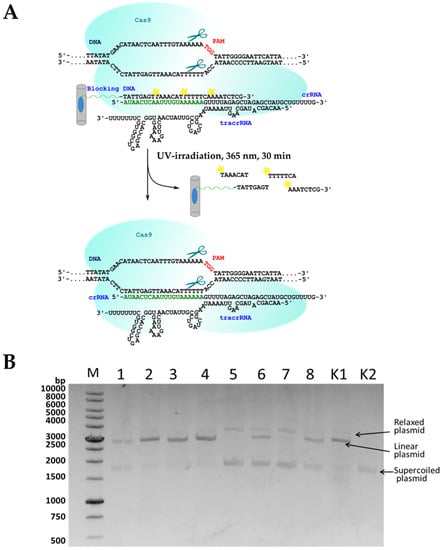 Inducible CRISPR/Cas9 systems have been developed to improve the spatiotemporal resolution of DNA cleavage [,]. For controlling the gene-editing system, two main approaches were developed. One approach is based on modified light-triggered Cas9 protein [,,]. The second one means the usage of photocaged CRISPR RNA (crRNA or gRNA) [,,,] or an auxiliary photoblocking oligodeoxyribonucleotide complementary to CRISPR RNA [,].