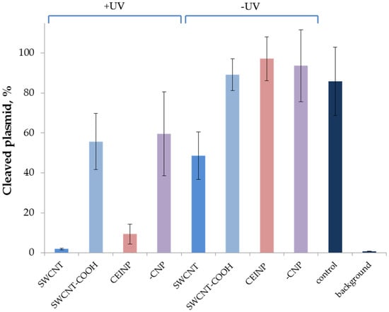 DNA plasmid cleavage by nanoCRISPR/Cas9 systems with CNP-immobilized (SWCNT, SWCNT-COOH, CEINP) with or without UV irradiation. crRNA immobilized on the surface using the PC-DNA (B30_PL). The plasmid cleavage was performed with and without UV irradiation. “Control” corresponds to the DNA cleavage by crRNA/tracrRNA/Cas9 in the absence of PC-DNA and CNPs. “Background” corresponds to the cleavage extent in the absence of nuclease, “-CNP”-to the non-immobilized duplex of PC-DNA (B30_PL) with crRNA. Conditions: crRNA immobilized through of B30_PL, the temperature of cleavage reaction was 37 °C, irradiation 30 min at 365 nm.