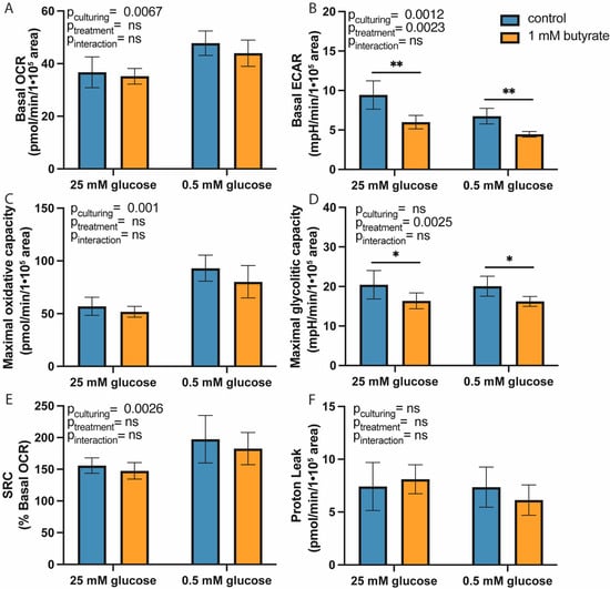 Metabolic flux analysis of high- and low-glucose-cultured HT29 cells following 72 h exposure to 1 mM butyrate. (A) Basal OCR. (B) Basal ECAR. (C) Maximal oxidative capacity. (D) Maximal glycolytic capacity. (E) SRC (%) and (F) Proton leak. (N = 3. Data are presented as mean ± SD; significance was determined using two-way ANOVA with factors culturing (25 mM or 0.5 mM glucose level in culture medium) and treatment (only medium or butyrate exposure), followed by Bonferroni post-hoc analysis. * = p < 0.05, ** = p < 0.01).
