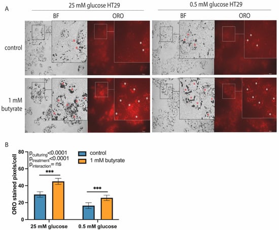 Lipid accumulation in high- and low-glucose-cultured HT29 cells following 72 h exposure to 1 mM butyrate. (A) Representative images showing brightfield (BF), nuclear (DAPI) and Oil-Red-O (ORO) staining in 25 mM and 0.5 mM glucose-cultured HT29 cells following 72 h exposure to 1 mM butyrate. Red and white stars (*) indicate lipid droplets stained using Oil-Red-O. (B) Representative bar graph showing quantification of ORO-stained image area in pixels corrected for cell number. (Images and bar graph are from a representative experiment of a total of N = 2. Data are presented as mean ± SD; significance was determined using two-way ANOVA followed by Bonferroni’s post-hoc analysis. p < 0.001 = ***). Scale bar = 70 µM.