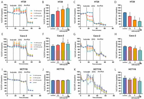 Since we observed a decrease in glycolytic function only after longer-term butyrate exposure, we went on to investigate the acute effects of butyrate on metabolic flux. To investigate this, we exposed high-glucose-cultured HT29, Caco-2 and HCT116 cells to an acute injection of butyrate during the Seahorse Extracellular Flux analysis. The 25 mM glucose-cultured HT29 cells and Caco-2 cells responded to acute butyrate exposure with increased OCR in a dose-dependent manner (Figure 3A,B,E,F). Given that 2DG (2-deoxyglucose) blocks glycolysis, which necessitates the sole use of mitochondria for ATP generation, we expected that 2DG would further increase the butyrate-induced OCR. Strikingly, OCR was attenuated by subsequent 2DG injection (Figure 3A,B,E,F). The decrease in OCR following 2DG injection suggests that butyrate is not the only substrate responsible for the increase in OCR, and that at least part of the observed increase in oxidation rate is fueled by glucose. This notion is strengthened by the observation that acute exposure to butyrate strongly reduced ECAR in a dose-dependent manner in the 25 mM glucose-cultured HT29 and Caco-2 cell lines (Figure 3C,D,G,H). Interestingly, the HCT116 cells did not respond to the acute butyrate exposure by increasing their OCR, but there was also an inhibitory effect on ECAR, significant at the highest butyrate concentration of 10 mM (Figure 3I–L).