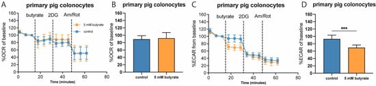 To verify whether the effect of butyrate on OCR and ECAR was not limited to merely cultured cell lines, we isolated primary pig colonocytes and analyzed mitochondrial and glycolytic parameters in response to an acute butyrate injection in these primary cells. Similar to HCT116 cells and different from Caco-2 and HT29 cells, primary pig colonocytes did not show any changes in OCR upon acute exposure to 5 mM of butyrate (Figure 4A,B). However, as with all cultured cell lines tested, upon injection of butyrate, pig colonocytes showed reduced glycolytic flux by approximately 50% of the total inhibition that was achieved by 2DG (Figure 4C,D). This indicates that the acute effects of butyrate on glycolysis are not restricted to cultured cells.