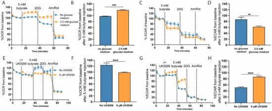 The altered response to acute butyrate exposure as a consequence of glycolysis inhibition in HT29 cells. (A,B) OCR response following butyrate exposure in absence or presence of 2.5 mM glucose in the medium (representative experiment of N = 2 independent experiments consisting of n = 6 wells). (C,D). ECAR response following butyrate exposure in absence or presence of 2.5 mM glucose in the medium (representative experiment of N = 2 independent experiments consisting of n = 6 wells). (E,F) OCR response upon inhibition of pyruvate oxidation using 8 µM UK5099 in the presence of 2.5 mM glucose (representative experiment of N = 3 independent experiments consisting of n = 13–15 wells). (G,H) ECAR response upon inhibition of pyruvate oxidation using 8 µM UK5099 (representative experiment of N = 3 independent experiments consisting of n = 13–15 wells; significance was determined for one representative experiment using repeated-measures ANOVA followed by Bonferroni’s post-hoc analysis. p < 0.01 = **, p < 0.001 = ***, p < 0.0001 = ****).