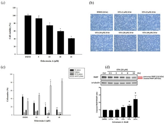 Ochratoxin A (OTA) is a mycotoxin which is mainly produced by several species of Aspergillus and Penicillium []. Mycotoxins are secondary metabolites of fungi that can cause disease and death in humans and animals []. OTA is widely found in various foods such as corn, wheat, barley, coffee beans, oilseeds, beer, grapes, wine, and animal feed [,,,]. Because OTA is a common contaminant of food and feed, humans and animals are frequently exposed to OTA in their daily lives []. Previous experiments have confirmed that exposure to OTA can lead to multifarious deleterious effects, including hepatotoxicity [], teratogenicity [], and nephrotoxicity []. A recent study revealed that OTA induced hepatoxicity by increasing oxidative stress, inflammation, and necrosis, and by inhibiting antioxidant enzymes in rat liver tissue []. The kidney is the primary target of OTA [], and the mechanisms that underly OTA nephrotoxicity include the inhibition of protein synthesis, DNA damage, cell cycle arrest, and cell apoptosis []. OTA has been recognized as a strong nephrotoxin that accumulates in proximal tubule epithelial cells and initiates cellular damage through oxidative stress, DNA damage, apoptosis, and inflammatory response []. In addition, OTA was shown to induce apoptosis in HK-2 cells through activation of MEK/ERK1-2 signaling [].