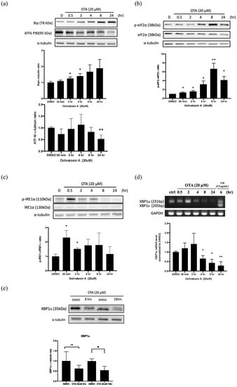 Several studies have established that the induction of binding immunoglobulin protein (BiP) is a marker for ER stress. It is a central regulator for ER stress due to its role as a major ER chaperone with anti-apoptotic properties and its ability to control the activation of transmembrane ER stress sensors (ATF6, IRE1α, and PERK) through a binding-release mechanism []. We clearly showed that 20 μM OTA enhanced the BiP induction in a time-dependent manner (Figure 2a). ER stress induction led to the activation of the proteolytic cleavage of membrane-bound 90 kDa ATF6 to a 50 kDa protein with transcription-activation properties []. As shown in Figure 2a, ATF6 (P90) showed a time-dependent decline, especially at the 24 h time point, with 20 μM of OTA treatment. Moreover, eIF2α phosphorylation led to an inhibition of translation initiation, which reduced the unfolded protein influx into the ER. The results showed that p-eIF2α (Figure 2b) time-dependently increased after OTA treatment. Furthermore, IRE1α phosphorylation (Figure 2c) was robustly induced at the early time point (30 min) with 20 μM OTA treatment, but with no obvious splicing XBP1 induction, as shown by RT-PCR (Figure 2d) and protein blotting (Figure 2e). These findings suggest OTA induced ER stress in a compound-specific manner in HK-2 cells.