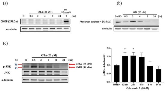 Several pathways contributed to ER-stress-dependent apoptosis during persistent cellular stress [], such as the C/EBP homologous protein (CHOP), which is also known as growth arrest and DNA damage-inducible gene 153 (GADD153). To explore the potential contribution of CHOP-dependent apoptosis, we treated HK-2 cells with OTA and observed the time-dependent expression for 24 h. Tunicamycin (TM) acted as a positive control of CHOP. There was no CHOP induction in the OTA treatment (Figure 3a). In addition, we further investigated the IRE1 axis of ER stress-mediated apoptosis, including c-JUN NH2-terminal kinase (JNK) and caspase-4 activation []. We found that OTA exposure induced precursor caspase-4 cleavage (Figure 3b). Additionally, JNK was robustly phosphorylated after 30 min of OTA treatment, and was dephosphorylated after 8 h, and was continued to be observed throughout (Figure 3c). Furthermore, the XBP1 axis of adaptive UPRs was further explored to confirm the potential activation of the pro-survival pathway. As shown in Figure 2d,e no XBP1s was detected in the OTA exposure in RT-PCR. In addition, the total XBP1u protein levels were also suppressed during OTA treatment. We speculate that OTA induced apoptosis through ER-stress-mediated JNK and caspase-4 activation, but not CHOP-mediated activation. Adaptive XBP1 was selectively inactive in OTA-mediated apoptosis.