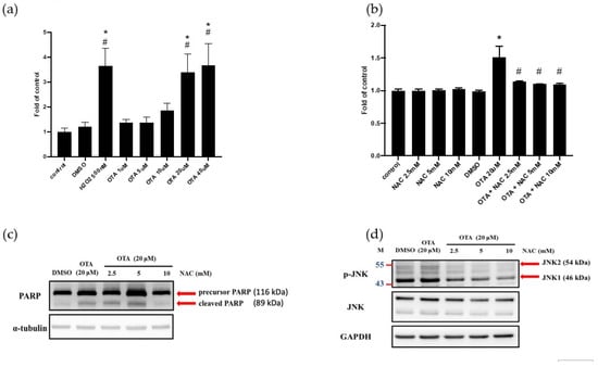 Previous studies have shown that OTA induces ROS in renal cells [,,]. Elevated ROS activated JNK and led to cell death from apoptosis to necrosis []. Therefore, we further investigated whether ROS could activate JNK phosphorylation after OTA treatment. We applied the DCFDA detection assay to analyze the intracellular ROS. The results showed that OTA increased the ROS in HK-2 cells in a concentration-dependent manner (Figure 4a). Whether ROS was involved in OTA-induced apoptosis, N-acetyl cysteine (NAC, an ROS scavenger) was used to elucidate the effect of ROS on cells. We found that different concentrations of NAC inhibited ROS after OTA treatment (Figure 4b). The cleaved form of PARP was decreased in the NAC (10 mM)-treated group of OTA-treated HK-2 cells (Figure 4c). NAC also inhibited the expression of OTA-induced p-JNK (Figure 4d). We speculate that OTA-induced renal tubular epithelium apoptosis can be activated by the ROS-mediated overwhelming of ER stress, positively contributing to HK-2 cell injury.