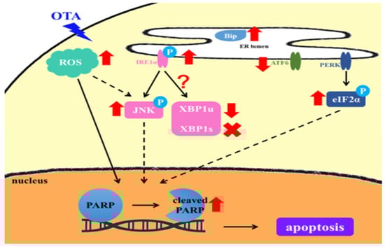The endoplasmic reticulum (ER) is capable of maintaining cellular homeostasis. Newly synthesized and secretory membrane proteins transfer into the endoplasmic reticulum for modification including protein folding, glycosylation, and disulfide bond formation []. Numerous environmental, physiological, and pathological insults disturb ER homeostasis, referred to as ER stress []. ER stress is evoked in various kidney diseases []. Previous studies have shown that OTA could induce ER stress and ROS production, causing glomerular mesangial cell apoptosis []. OTA was also shown to induce ER stress in the kidney and spleen of pigs [].