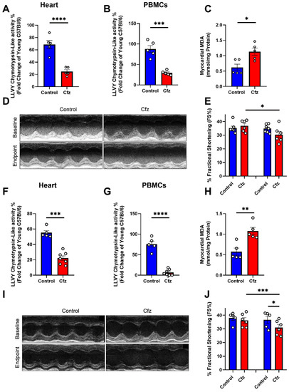 Our first step was to investigate the proteasome activity in heart and peripheral blood mononuclear cells (PBMCs) of the aged mice (18 months of age) compared to young adult mice (13–14 weeks of age). We found that both in PBMCs and heart, aging leads to a decrease in proteasome activity (LLVY- chemotrypsin-like activity) compared to young adult mice (Supplementary Figure S1). Furthermore, we sought to confirm that advanced age does not mitigate Cfz’s proteasomal inhibition, therefore, we initially addressed the chemotrypsin-like activity in the PBMCs and the myocardium in the treated aged mice. We found that in the two-dose protocol, Cfz significantly reduced LLVY- chemotrypsin-like activity, corresponding to 26S proteasome activity, both in the heart (Figure 1A) and the PBMCs (Figure 1B). Moreover, we observed that malondialdehyde (MDA), a biomarker of lipid peroxidation widely used in cardiovascular diseases [14], was significantly increased in the hearts of the Cfz-treated mice (Figure 1C). Fractional shortening % (FS%) was found to be significantly decreased in the Cfz group compared to its baseline values (Supplementary Tables S1–S3, Figure 1D,E). In the four-dose protocol, Cfz showed a more pronounced phenotype concerning the proteasomal inhibition both in the myocardium (Figure 1F) and the PBMCs (Figure 1G) accompanied by a significant increase in myocardial MDA content (Figure H). Four doses of carfilzomib led to a more denounced decline in FS %, which was found to be significant both compared to baseline values and to the control group (Figure 1I,J).