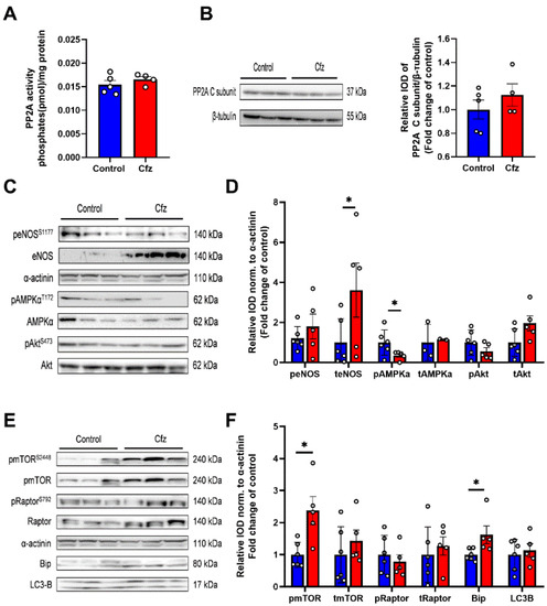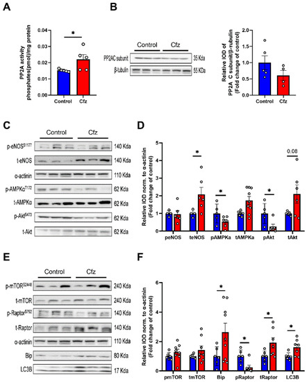 Subsequently, we focused on the four-dose protocol, and we investigated the activity of PP2A in the myocardium. We observed that in line with the young adult mice, four doses of Cfz increased PP2A activity (Figure 3A) and did not upregulate PP2A expression (Figure 3B). Concerning the molecular signaling, Cfz upregulated eNOS expression, decreased AMPKα phosphorylation (Figure 3C,D), and showed a trend of increase in Akt expression versus controls (p = 0.08). Concerning ER stress and autophagic signaling, Cfz increased both Bip, LC3-B, and Raptor expression while decreased Raptor phosphorylation (Figure 3E,F). Thus, our results demonstrate that Cfz-mediated AMPKα dephosphorylation and increased Bip expression, as observed both in the two- and four-dose protocol is a key mediator of the decline of LV function induced by Cfz. Interestingly, Cfz increased PP2A activity only in the four-dose protocol, indicating that maybe prolonged Cfz administration is required for PP2A activation in the aged mice.