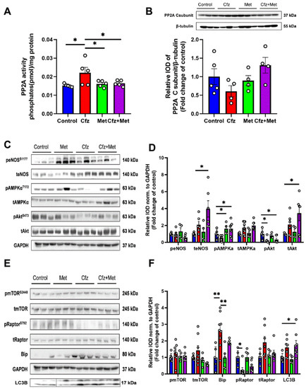 Subsequently, we initially assessed myocardial PP2A activity and expression. We found that Cfz increased PP2A activity, while Met decreased PP2A activity in the myocardium in the coadministration group. PP2A expression was unchanged between study groups (Figure 5A,B). Met increased AMPKα phosphorylation alone and in combination with Cfz, whereas when co-administered with Cfz partially decreased Bip expression and increased teNOS, tAkt, and LC3B expression. Cfz decreased Akt phosphorylation both alone as well as in the coadministration group, an effect not reversed by Met (Figure 5C–F). Therefore, Met coadministration with Cfz led to the induction of AMPKα/LC3B-dependent autophagy and a partial modulation of ER stress marker Bip in the aged myocardium leading to cardioprotection in the translational model of Cfz cardiotoxicity in aged mice.