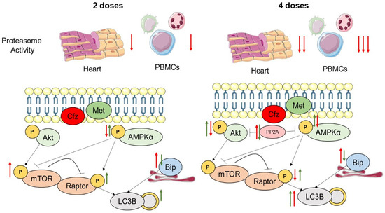 Figure 6. Proposed mechanism of carfilzomib-induced cardiotoxicity and metformin prophylactic effect in the aged myocardium. Red arrows correspond to carfilzomib’s effect, and green arrows correspond to metformin’s effect. Arrows indicate activation/induction, and blunted lines indicate inhibition. Akt, protein kinase B; AMPKα, AMP-activated kinase α; Bip, binding immunoglobulin protein; Cfz, carfilzomib; Met, metformin; mTOR, mammalian target of rapamycin; LC3B, microtubule-associated proteins 1A/1B light chain 3B; PP2A, protein phosphatase 2 A; Raptor, regulatory-associated protein of mTOR.