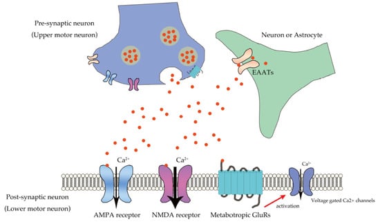 Neurons in the central nervous system (CNS) use glutamate, an excitatory neurotransmitter. Depolarization of pre-synaptic neurons (upper motor neurons) leads to the vesicular release of glutamate into the synaptic cleft; after secretion from the axon terminal of the upper motor neurons, glutamate activates the post-synaptic neurons (lower motor neurons) through specific membrane glutamate receptors []. Glutamate receptors (GluRs) are classified into two major receptor families: ionotropic GluRs and metabotropic GluRs (mGluRs) []. Ionotropic GluRs are ligand-gated ion channels that are composed of four subunits that mediate an immediate influx of extracellular Na+ and/or Ca2+, regulating membrane depolarization and diverse signal transduction events []. Alpha-amino-3-hydroxy-5-methyl-4-isoxazole propionic acid (AMPA) receptors regulate the membrane potential and mediate the vast majority of fast excitatory neurotransmission, whereas N-methyl-D-aspartate (NMDA) receptors have a voltage-dependent ion channel that mediates excitatory neurotransmission by passing large amounts of Ca2+, Na+, and K+ during depolarization [,,]. In contrast, mGluRs are G protein-coupled receptors and are subclassified into three groups based on sequence homology. Groups I, II, and III include mGluR1 and mGluR5; mGluR2 and mGluR3; and mGluR4, mGluR6, mGluR7, and mGluR8, respectively. In pre-synaptic neurons, Group I mGluRs promote glutamate release, whereas Group II and III mGluRs inhibit glutamate release. In post-synaptic neurons, mGluRs act relatively slowly compared to ionotropic GluRs, and Group I mGluRs increase intracellular Ca2+ influx via G protein signaling cascades [,].