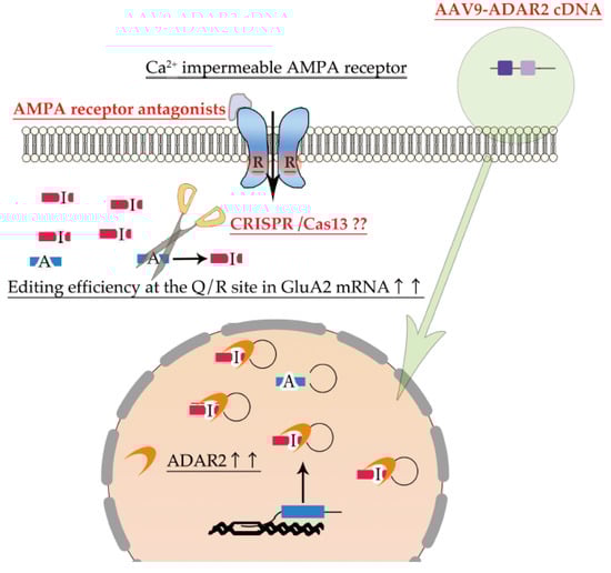As a reduction in RNA editing activity is involved in the pathogenesis of neurological diseases (Table 1), the normalization of RNA editing activity in the motor neurons is a therapeutic strategy for not only sporadic ALS and some familial ALS but also various neurological diseases for which no cure can be achieved by current therapies (Figure 4).