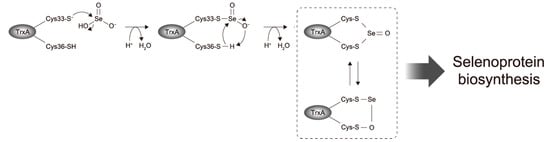 Shimizu, A.; Tobe, R.; Aono, R.; Inoue, M.; Hagita, S.; Kiriyama, K.; Toyotake, Y.; Ogawa, T.; Kurihara, T.; Goto, K.; et al. Initial Step of Selenite Reduction via Thioredoxin for Bacterial Selenoprotein Biosynthesis. Int. J. Mol. Sci. 2021, 22, 10965. https://doi.org/10.3390/ijms222010965