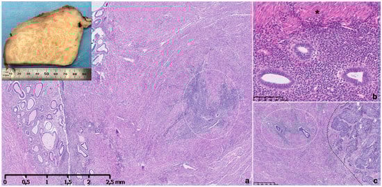 Macroscopic and microscopic appearance of adenomyosis. Thickened and trabeculated appearing myometrial wall with ill-defined hypertrophic swirls of smooth muscle of sectioned uterus with adenomyosis (a, inset). Histopathological image of uterine adenomyosis observed in hysterectomy specimen, with endometrial glandular and stroma invading the muscular myometrium (within circle) (a). Higher-power view showing ectopic endometrial glands and stroma surrounded by hyperplastic myometrium (asterisk) (b). Ectopic glandular epithelium is proliferative type and stroma is inactive, non-mitotic and composed of monotonous cells (b). A specimen showing an endometroid carcinoma infiltrating myometrial wall on the right (black line) and adenomyosis foci on the left (within line) (c). Hematoxylin and eosin stain.
