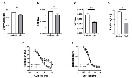 Endothelial dysfunction is mainly attributable to reduced ability of the endothelium to induce vasorelaxation in response to various stimuli due to reduction in nitric oxide (NO) bioavailability [,]. Recent in vitro studies have shown that HIV-derived Tat is associated with oxidative stress, vascular inflammation, increased expression of cell adhesion molecules and reduced expression of endothelial nitric oxide synthase (eNOS), which effects can contribute to NO depletion and consequent impairment of endothelium-dependent vasodilatation. It has been reported that Tat induces oxidative stress and inflammatory mechanisms in brain endothelial cell which may play role in the disruption of the blood–brain barrier (BBB) and lead to HIV-related dementia [,,]. Others have shown that treatment of endothelial cells with Tat resulted in elevated cell surface expression of adhesion molecules, such as intercellular adhesion molecule 1 (ICAM-1), vascular cell adhesion molecule 1 (VCAM-1), and endothelial leucocyte adhesion molecule-1 (ELAM-1), contributing to production of reactive oxygen species (ROS) and endothelial cell activation [,,,]. Lastly, Tat-incubated endothelial cells from porcine coronary arteries displayed reduced eNOS expression, which was correlated with impaired vascular function []. Nevertheless, the molecular mechanisms in which Tat induces endothelial dysfunction remain undetermined in an in vivo setting. In the present study, we tested the hypothesis that the HIV-derived Tat protein induces endothelial dysfunction through alteration in adipose mass and leptin production causing excessive oxidative stress.