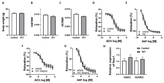 Tat does not have direct effect on endothelial function. Body weight (A), subcutaneous fat depot (SQF/BW; B), visceral fat depot (VAT/BW; C), concentration response curves (CRC) to acetylcholine (Ach; D) and sodium nitroprusside (SNP; E) in aortic rings from control (vehicle-treated) and TAT-treated mice (TAT, 3.2 µg/kg per day for 3 days, i.p.). CRC to acetylcholine (Ach; F) and sodium nitroprusside (SNP; G) in the presence of vehicle or Tat protein (20 ng/mL) in aortic rings from control mice. Gene expression of Nox1 (H) in vehicle (control) and Tat-treated (20 ng/mL for 24 h) HAEC and HUVEC cells. Data are presented as mean ± SEM. n = 5–6.
