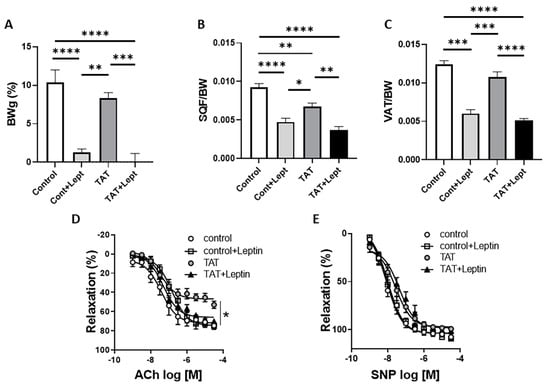 Leptin restores TAT-induces endothelial dysfunction in mice. Body weight (A), subcutaneous fat depot (SQF/BW; B), visceral fat depot (VAT/BW; C), concentration response curves to acetylcholine (Ach; D) and sodium nitroprusside (SNP; E) in aortic rings from control (vehicle-treated) and TAT-treated mice (TAT, 3.2 µg/kg per day for 4 weeks, i.p.) in the presence or absence of leptin treatment (0.3 mg/kg per day for 7 days, via osmotic minipump). Data are presented as mean ± SEM. n = 5–6; * p < 0.05; ** p < 0.01; *** p < 0.001, and **** p < 0.0001 vs. Ctrl.