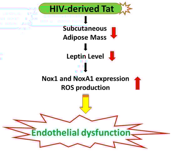 In conclusion, using an in vivo approach, our study demonstrated that the HIV transactivator protein Tat contributes to HIV-associated endothelial dysfunction via promoting adipose mass loss, and leptin level reduction leading to an upregulated expression of Nox1 and NoxA1 (Figure 5). Targeting the Nox1 and leptin signaling might be an attractive therapeutic approach for CV disorders in PLWH.
