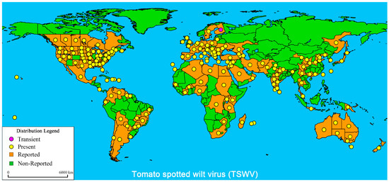 Global distribution of Tomato spotted wilt virus (TSWV). The global distribution of TSWV disease published by the EPPO Global Database (20 May 2021) and modified about China distribution [21,22,23,24]. The purple marks indicate transient infection, yellow marks indicate present infection, orange marks indicate reported infection, and green marks indicate non-reported infection.
