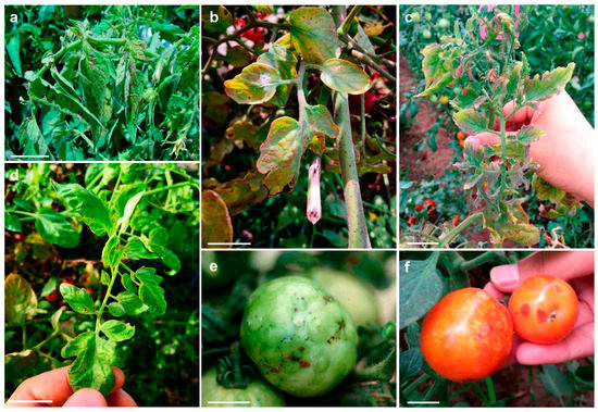 Typical symptoms of Tomato spotted wilt virus (TSWV) in different growth stages of field tomato plants. (a,b) dark-brown flecks and necrotic spots; (c,d) turn into copper-colored rolls, purple veins, terminal bud necrosis, and rings on leaves and stems; (e) dark-brown flecks, faded necrotic spots and tumor-like protrusions; (f) chlorotic and bright yellow rings. The white bar represents 25 mm.