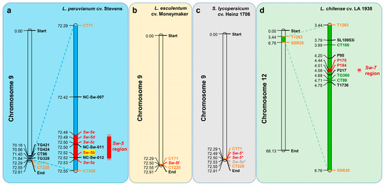 Mapping of TSWV resistance genes on tomato chromosomes. (a) The site of Sw-5 (Sw-5a, Sw-5b, Sw-5c, Sw-5d, and Sw-5e) on chromosome 9 of L. peruvianum cv. Stevens. The red boxes represent the narrowest area where the Sw-5 cluster region is located [50]; (b) the site of Sw-5f on chromosome 9 of L. esculentum cv. Moneymaker; (c) the site of Sw-5*, Sw-5aS on chromosome 9 of Solanum lycopersicum cv. Heinz 1706; (d) the site of Sw-7 region on chromosome 12 of L. chilense cv. LA 1938. The green boxes represent the narrowest area where the Sw-7 region is currently located. The orange-yellow font markers (T1263 and SSR20) represent the markers mapped by Stevens [72] and Dockter et al. [66]. Green font markers (CT100 and TG360) and red font markers (P175 and P194) represent the markers mapped by Scott et al. [67].