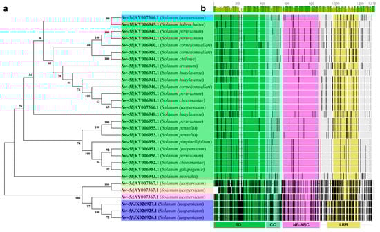 Cluster and topology analysis of the Sw-5 gene cluster and orthologs from different tomatoes. (a) Cluster analysis based on the Sw-5 gene cluster DNA sequence; (b) alignment and topology analysis based on the Sw-5 protein cluster, an overview of the roles of the amino-terminal Solanaceae domain (SD) and coiled-coil (CC), central nucleotide-binding adaptor shared by apoptotic protease-activating factor-1 (APAF-1), R proteins, and a CED-4 (NB-ARC); and carboxy-terminal leucine-rich repeat domains (LRR) in the Sw-5 protein cluster. The black vertical lines indicate an amino acid difference, and gray blocks indicate the same amino acid sequence.