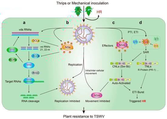 Mechanism with plant innate immunity against Tomato spotted wilt virus (TSWV). (a) TSWV invaded by thrips or mechanical inoculation, and depend on the plant cellular machineries to complete their life; (b) RNA interference (RNAi) with plant innate immunity is triggered to prevent TSWV invasion, viral dsRNA (vds RNAs) from viral mRNA of TSWV is cleaved into 21, 22-nt viral small interfering RNAs (vsi RNAs) by the RNAse III Dicer-like proteins (DCLs); the vsiRNAs into Argonaute (AGO) activates the RNA-induced silencing complex (RISC) and activates the complementarity and cleavage of viral target RNAs; (c) to further combat TSWV invasion, the CNLs (including Sw-5b protein) from tomato sense the effectors NSm and NSs, robust effector-triggered immunity (ETI); and produce the hypersensitive cell death response (HR); (d) then, trigged PAMP-triggered immunity (PTI) and ETI lead to the accumulation of salicylic acid (SA), jasmonate (JA), ethylene (ET), and abscisic acid (ABA). SA induces the rapid transcriptional activation of a string of resistance (R) genes. Abbreviations: SAR, systemic acquired resistance; RDRs, the RNA-dependent RNA polymerases; SD, Solanaceae domain; CC, coiled-coil domain; NB, nucleotide-binding domain; NB-ARC, Apaf-1, R-protein, and CED-4 domain; LRR, leucine-rich repeat domain; CNLs, coiled-coil nucleotide-binding leucine-rich repeat receptors; TIR, Toll/interleukin-1; TNLs, Toll/interleukin-1 nucleotide-binding leucine-rich repeat receptors; R-protein, resistance protein; NSs, nonstructural protein encoded by the S RNA segment; NSm, nonstructural protein encoded by the M RNA segment.