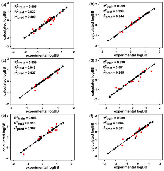Linear correlation diagram between the experimental and calculated LogBB values for (a) Subset 1, (b) Subset 2, (c) Subset 3, (d) Subset 4, (e) Subset 5, (f) Subset 6, (g) Subset 7, and (h) Subset 8. Indicated in black and red circles are the molecules in the training and test sets, respectively.