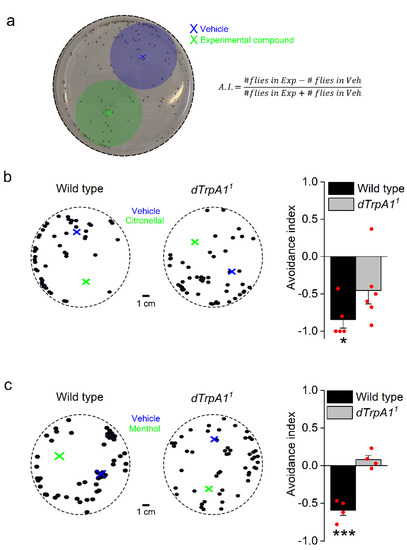 Around 40 flies (50% male, 50% female) were placed in a 14 cm diameter Petri dish covered with 1% agar. Dishes were rotated to prevent direction bias. Recordings started immediately after loading the vehicle and experimental compounds. To avoid the spread of the tested compounds (citronellal, menthol and respective vehicles) by the flies themselves, the compounds were applied on separate filter papers that were allowed to dry for 1 min before they were placed in an inverted lid of a 1.5 mL Eppendorf tube in the arena (see Figure 1 blue and green crosses in the arena). In this way the source of the olfactory stimulus was not accessible for the flies, and the olfactory stimulus originated from one fixed point in the arena. Thirty minutes after loading of the chemical compounds, the position of each fly was assessed in the arena. This was done by thresholding the image until each individual fly was selected. Subsequently each fly’s position as well as the position of the chemical compounds was exported as an X-Y coordinate. Then, the field for the vehicle and the experimental compound was set as the circular surface with the center at the X-Y position of the respective compound and a radius: . The number of flies located in the field surrounding the experimental compound (Exp.) or vehicle (Veh.) were counted 30 min after applying the compounds, and the avoidance index (A.I.) was calculated as previously described [11] (Figure 1a).