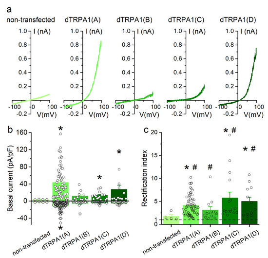 2.2. Basal Currents in HEK293T Cells Transfected with dTRPA1 Isoforms