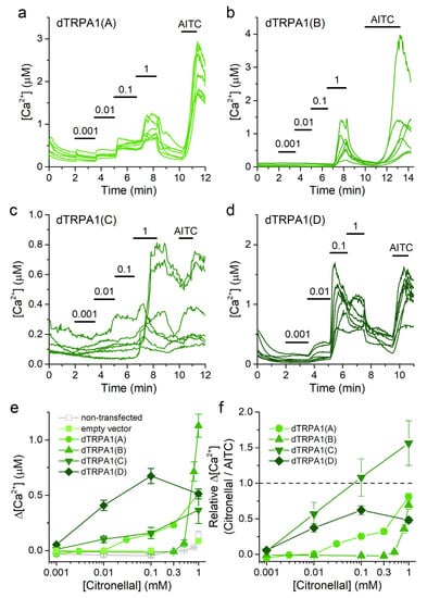 Citronellal increases intracellular [Ca2+] in cells transfected with dTRPA1 isoforms. (a–d) Example traces of changes of intracellular Ca2+ concentration induced by citronellal (0.001–1 mM) and AITC (100 µM) in HEK293T cells expressing either dTRPA1(A), dTRPA1(B), dTRPA1(C) or dTRPA1(D). (e,f) Concentration dependence of the average amplitude of intracellular Ca2+ increase induced by citronellal; panel (e) raw data and panel (f) data obtained by normalizing to the amplitude of the response to AITC in each cell. n = 102–298, 21–75, 30 and 39 for isoforms A to D, respectively.
