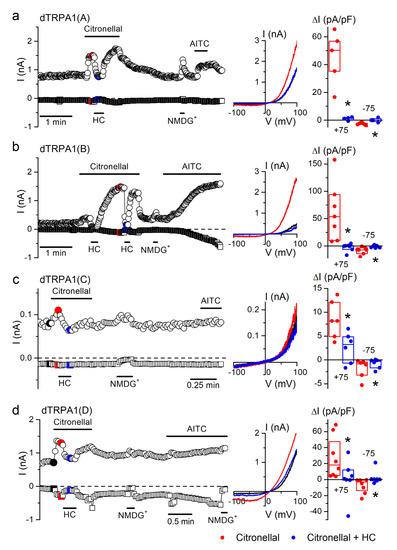 Citronellal increases whole-cell currents in the four dTRPA1 isoforms. (a–d) Examples of the effects of citronellal (1 mM), HC-030031 (HC; 100 µM) and AITC (100 µM) on the currents recorded at +75 mV (circles) and −75 mV (squares) in whole-cell patch-clamp experiments in HEK293T cells expressing either dTRPA1(A), dTRPA1(B), dTRPA1(C) or dTRPA1(D). A solution where all cations were replaced by N-methyl-D-glucamine (NMDG+) was used to assess the presence of leak currents [44]. The middle insets represent current traces recorded at the time points indicated by the corresponding colors in the left panels. The dot plots on the right represent the change in current density amplitude with respect to baseline values (recorded at +75 and −75 mV). The horizontal lines represent medians and the boxes represent the 25–75 percentiles. Application of citronellal (1 mM, red symbols) induced whole-cell current increases in cells expressing: dTRPA1(A) (p = 0.003, n = 5), dTRPA1(B) (p = 0.01, n = 7), dTRPA1(C) (p = 0.0016, n = 6) or dTRPA1(D) (p = 0.01, n = 8, one-sample t-test vs. 0). The TRPA1 blocker HC-030031 (HC; 100 µM) inhibited citronellal-induced (1 mM) currents (blue symbols) in cells expressing dTRPA1(A) (p = 0.003, n = 4–5), dTRPA1(D) (p = 0.024, n = 7–8; two-sample t-test), dTRPA1(C) (p = 0.00006, n = 6) or dTRPA1(B) (p = 0.018, n = 7; one tailed paired sample t-test).