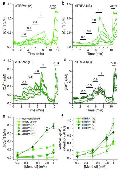We found that HEK293T cells transfected with either of all dTRPA1 isoforms displayed rises in intracellular Ca2+ concentration upon stimulation with menthol at increasing concentrations (Figure 5a–d). In contrast, neither non-transfected HEK293T cells nor cells transfected with the empty vector respond to menthol when applied at concentrations up to 1 mM (Figure 5e). We did not apply menthol above this concentration because of previous reports demonstrating endogenous Ca2+ release from intracellular stores [45]. This limited the possibility of reaching maximal dTRPA1 activation and precluded the accurate determination of the EC50 values. As for the analysis of data on citronellal, we therefore estimated the sensitivity to menthol from the minimal concentration at which the Ca2+ increase was detectable (tested as significant difference above the baseline Ca2+ level with a one sample Wilcoxon signed rank test). As such, the sensitivity series was dTRPA1(A) > dTRPA1(D) > dTRPA1(C) > dTRPA1(B) (Figure 5e). The maximal amplitude of the responses to menthol followed the series: dTRPA1(D) > dTRPA1(A) > dTRPA1(B) = dTRPA1(C) (Figure 5e). The concentration dependencies normalized to the amplitude of the responses to AITC revealed that the responses of dTRPA1(C) to 1 mM menthol were comparable to the responses to AITC, whereas the responses of dTRPA1(A), dTRPA1(B) and dTRPA1(D) were smaller (Figure 5f).