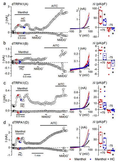 Menthol increases whole-cell currents in the four dTRPA1 isoforms. (a–d) Example of the effects of menthol (1 mM), HC-030031 (HC; 100 µM) and AITC (100 µM) on the amplitude of whole-cell currents measured at +75 mV (circles) and −75 mV (squares) in HEK293T cells expressing either dTRPA1(A), dTRPA1(B), dTRPA1(C) or dTRPA1(D). An extracellular solution where all cations were replaced by N-methyl-d-glucamine (NMDG+) was used to assess the size of leak currents. The middle insets show current traces recorded at the time points indicated by the corresponding colors in the left panels. The dot plots on the right show the change in current density amplitude with respect to baseline values (+75 mV and −75 mV). The horizontal lines represent the medians and the boxes represent the 25–75 percentiles. Application of menthol (1 mM, red symbols) increased whole-cell current in cells expressing: dTRPA1(A) (p = 0.001, n = 8), dTRPA1(B) (p = 0.0003, n = 5), dTRPA1(C) (p = 0.0006, n = 10) or dTRPA1(D) (p = 0.003, n = 7, one-sample t-test vs. 0). The TRPA1 blocker HC-030031 (HC; 100 µM) partly inhibited menthol-induced currents (blue symbols) in cells expressing dTRPA1(A) (p = 0.04, n = 6–8), dTRPA1(B) (p = 0.024, n = 4–5; two-sample t-test), dTRPA1(C) (p = 0.0004, n = 10) or dTRPA1(D) (p = 0.004, n = 7; one tailed paired sample t-test). * p < 0.05.