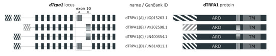 - Gu, P.; Gong, J.; Shang, Y.; Wang, F.; Ruppell, K.T.; Ma, Z.; Sheehan, A.E.; Freeman, M.R.; Xiang, Y. Polymodal Nociception in Drosophila Requires Alternative Splicing of TrpA1. Curr. Biol. 2019, 29, 3961–3973.e6. [Google Scholar] [CrossRef]