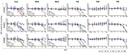 Cell viability of PHH spheroids after long-term repeated exposure to increasing concentrations of the test compounds. Concentration–response curves were obtained by quantifying total ATP content on days 1, 7, 14, 21 and 28 after first exposure. Concentrations were log-transformed and plotted using GraphPad Prism Software (Version 8.2.1). The DILI risk posed by the drugs was assessed by calculating the SMDILI on days 7 and 14. Results are expressed as mean ± standard deviation of at least three spheroids per donor and per time-point. ATP—adenosine triphosphate; BOS—bosentan; CIx—cholestatic index; CyA—cyclosporine-A; d—day; MAC—macitentan; PQ—paraquat; SMDILI—safety margin for drug-induced liver injury; TAR—tartrazine; TRI—triclosan.
