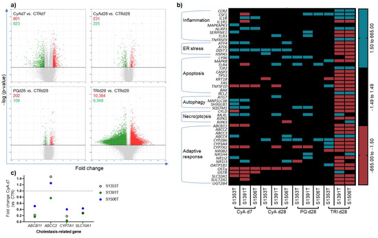 According to the visual representation of the total number of significantly modulated genes (volcano plots, Figure 4a), a 3–4-fold higher number of differentially expressed genes was found after a 7-day (a total of 1624) comparatively to a 28-day (a total of 456) treatment with CyA. This highlights the importance of time-point selection for the transcriptomic analysis. On the other hand, prolonged PQ exposure resulted in the lowest number of significantly deregulated genes (total of 311), while TRI significantly modulated a striking total of 19,952 genes (Figure 4a). An analysis of the averaged global PHH response can, however, be deceiving, as it may hide an outlier response, as is the case of donor S1353T after TRI exposure (Figure 4a,b). Next, a more in-depth analysis was performed on specifically modulated genes relevant for cholestasis, using the updated AOP of cholestasis as benchmark [18]. All the genes tested in this study are summarized in Table S2 including their relevant biological role or function. In a glimpse, the transcriptomic responses to the tested compounds varied considerably between the three donors (Figure 4b). A 7-day exposure to CyA 5 µM resulted in upregulation of markers related to inflammation, such as interleukin (IL)1β and NOD-, LRR- and pyrin domain-containing protein 3 (NLRP3) in donors S1391T and S1506T, while donor S1353T showed an upregulation of MAP kinase-activated protein kinase 3 and serpin E1 (Figure 4b). The upregulation of activating transcription factor 4 in two donors, and of DNA damage-inducible transcript 3 in all donors supports an activation of the ER stress response. Additionally, genes related to autophagy, such as microtubule associated protein 1 light chain 3β and sequestosome, and relevant for necroptosis, as the mixed lineage kinase domain like pseudokinase (MLKL) gene, were found upregulated in two donors. Regarding the adaptive response described in the AOP on drug-induced cholestasis [17], only a few genes demonstrated to be in agreement with its activation. This is the case of the upregulation observed for ATP binding cassette (ABC)C4 (or multidrug resistance-associated protein 4) and nuclear receptor (NR)1I2 (or pregnane X receptor) in donor S1353T, and the downregulation of cytochrome P450 (CYP)7A1 and solute carrier (SLC)10A1 in donors S1353T and S1391T. In these two donors, ABCB11 (or BSEP) has, in fact, been found downregulated by CyA. The results concerning ABCB11, CYP7A1, ABCC2 and SLC10A1 were confirmed by RT-qPCR analysis in PHH spheroids exposed during 7 days to CyA 5 µM (Figure 4c). Curiously, some of these changes, namely the ones concerning inflammation and autophagy, failed to be present after a 28-day exposure to CyA 5 µM (Figure 4b), again confirming the essentiality of time-point selection. With respect to a 28-day exposure to PQ 2 µM, only minor changes in the expression of genes related to drug-induced cholestasis could be observed in one or two donors, including a few genes related to inflammation (i.e., colony stimulating factor, serpin E1 and toll like receptor 3), apoptosis (i.e., lymphocyte antigen 96 and toll like receptor 4), autophagy (i.e., sequestosome 1) and necroptosis (i.e., MLKL) (Figure 4b). As for the adaptive response, only CYP2B6 and CYP7A1 were simultaneously affected by PQ in two donors. TRI, on the other hand, seemed to induce a rather unstable genetic phenotype (Figure 4b). Indeed, while many inflammation markers were upregulated (e.g., C-C motif chemokine receptor 2, colony stimulating factor 1, IL1β and NLRP3), others were downregulated (e.g., IL1 receptor 1, SERPINE1 and toll like receptor 3). Yet, overall a particular downward trend could be distinguished with the majority of differentially regulated genes being downregulated, such as cholestasis mechanisms ER stress, apoptosis, autophagy and adaptive response-related markers (Figure 4b). In this regard, the downregulation of CYP7A1, organic anion transporter 1B1 and SLC10A1 in two donors is compliant with the AOP on drug-induced cholestasis [17] and confirms results previously obtained in spheroid cultures of HepaRG cells and in PHH in long-term 2D-sandwich culture [18,20]. Concerning donor S1353T, only a few genes related to cholestasis were upregulated by TRI 100 µM (Figure 4b). Of interest are the genes encoding CYP2B6, CYP3A4 and CYP7A1, from which the former is implicated in TRI metabolism, while CYP3A4 and CYP7A1 are involved in BA synthesis, hence contributing for BA accumulation in hepatocytes.
