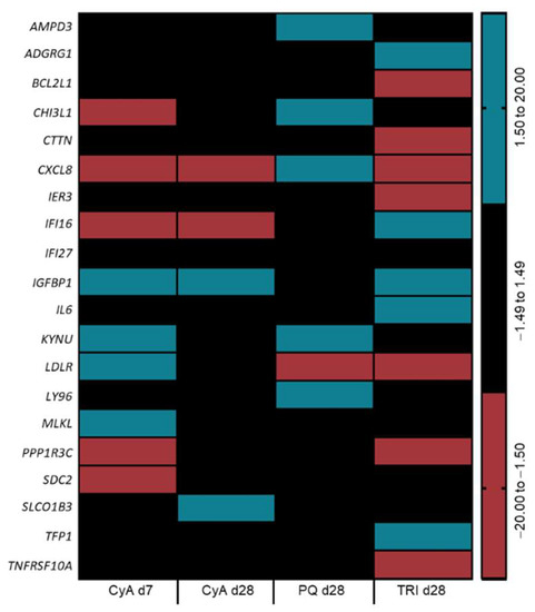 Considering that the CIx below 0.80 for PQ 2 µM in two donors and for TRI 100 µM in the three donors indicated a potential cholestasic risk, the effects of these compounds at the mRNA level were further studied after a 28-day exposure, using CyA 5 µM as a reference for cholestatic effects.