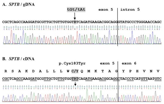 Particularly interesting for us were those genes associated with the pathogenesis of HS. Analyses were focused on the five genes best known to be related to the HS phenotype (ANK1, SPTB, SPTA1, SLC4A1, and EPB42) (for details, see Additional File S2). Verifying the variants of the SPTB gene detected in the patients’ whole exome sequence led us to identify in gDNA and cDNA the novel heterozygous missense mutation p.C183Y (NM_001355436.2:c.715G>A) in exon 5 of the SPTB gene in both patients (Figure 1). No variants were found in the EPB42 gene. All changes detected in the ANK1 and SPTA1 genes have already been published (SNP NCBI). Their frequency, inheritance pattern, and information contained in the ClinVar database allowed us to exclude their involvement in the studied HS phenotype. Eight new changes and one known change (located close to each other) were detected in the SLC4A1 gene in patients J41 and/or J42 (Additional File S1, Figure S2A). These changes are located in intron 11 near exon 11 (NC_000017.10:g. 42331825-42331844, NC_000017.11:g.44254456-44254476). Verification of these changes in gDNA, however, did not confirm the occurrence of these changes in the studied genomes (Additional File S1, Figure S2A,B). Furthermore, experimentally validated mRNA transcript sequences match the human reference sequence (Additional File S1, Figure S2C). During DNA analysis, several common polymorphisms were validated using the Sanger method (Additional File S1, Table S5).