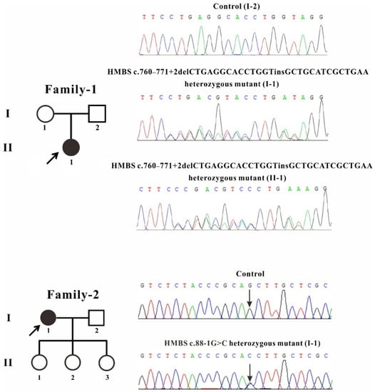 The two AIP patients came from two unrelated Chinese families. After Sanger sequencing, the proband from family 1 inherited a heterozygous HMBS mutation (c.760–771+2delCTGAGGCACCTGGTinsGCTGCATCGCTGAA) from his mother (Figure 1). The mutation is located at the end of exon 11 and the head of intron 11 of the HMBS gene. The proband presents with intestinal obstruction and confusion during the acute attack. In addition, we confirmed the second novel splicing mutation c.88-1G>C located in the intron 2 of HMBS gene in the proband (I-1) of family 2 (Figure 1).