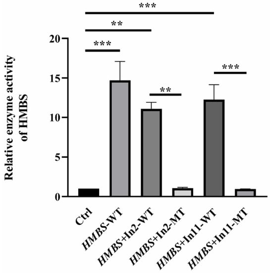 Enzyme activities of the HMBS mutants. The result of enzyme activity assay from HEK293T cells transfected with HMBS-WT, HMBS+In2-WT, HMBS+In2-MT, HMBS+In11-WT or HMBS+In11-MT plasmids. Data were presented as the mean ± SD from three independent experiments; *** p < 0.001; ** p < 0.01.