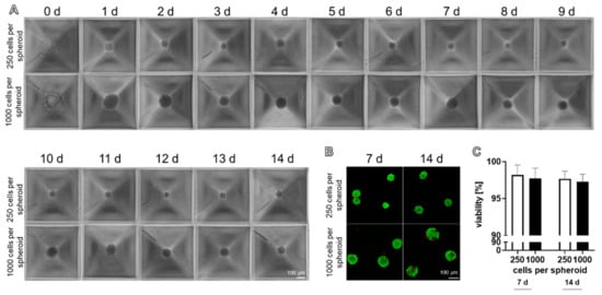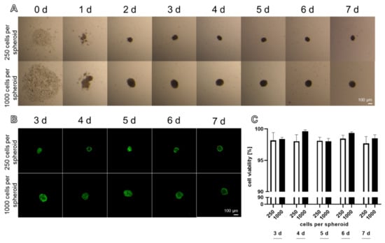 Using the spheroid plate, round spheroids became evident after 24 h (Figure 2A). They were sufficiently stable for harvesting after 24–48 h (Figure 2A). Spheroids reflected a high cell viability with only a few dead cells (Figure 2B). The comparison of spheroids consisting of 250 and 1000 cells harvested either at 7 or 14 days showed no significant difference in viability, independent of the cell number and time point of analysis (Figure 2C).