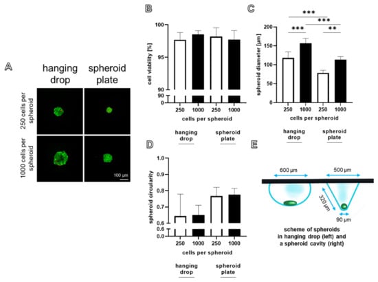 The viability, sizes, and circularity of the spheroids produced by both methods with both cell numbers were directly compared. Round and uniform spheroids were achieved with both techniques. There was no significant difference in the viability of spheroids produced with both methods, irrespective of the cell number used for spheroid assembly (Figure 3A,B).
