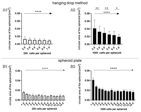 The circular surface area was measured in spheroids prepared either by the hanging-drop- (A1,A2) or spheroid-plate-based methods (B1,B2). (A1,B1) 250 cells per spheroid. (A2,B2) 1000 cells per spheroid. Statistics: n = 3 independent experiments were performed with cells of three different donors. One-way ANOVA (Tukey’s multiple comparisons test) for comparison between groups. Linear trend test (*→ p values: * <0.05, ** <0.01, **** <0.0001 (A1–B2).