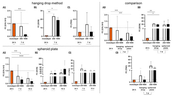 Gene expression in spheroids prepared in hanging drops or using the spheroid plate in comparison to that in monolayer culture. (A) Collagen type 1 (COL1A1), (B) decorin (DCN), (C) tenascin C (TNC). (A1–C1) Gene expression of ligamentocyte spheroids prepared by the hanging drop method after 7 days. (A2–C2) Gene expression after 7 and 14 days in spheroids prepared with the spheroid plate. (A3–C3) Direct comparison of the gene expression in spheroids prepared by both methods after 7 days. Statistics: n = 5 independent experiments were performed with cells of five different donors. One-way ANOVA (Tukey’s multiple comparisons test) for comparison between groups. Grubbs test (α = 0.05). p values: * < 0.05, ** < 0.01, *** < 0.001, **** < 0.0001 (A1–C3).