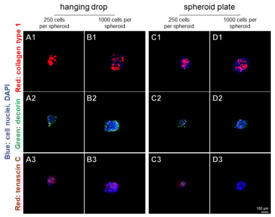 Distribution of ligament-related ECM components in spheroids prepared in hanging drops or using the spheroid plate after 7 days. (A1–D1) Collagen type 1 (red), (A2–D2) decorin (green) and (A3–D3) tenascin C (red). Cell nuclei were counterstained using 4’,6-diamidino-2-phenylindole (DAPI). Hanging-drop-derived spheroids consisting of 250 (A1–A3) or 1000 (B1–B3) ligamentocytes. Spheroids prepared by the spheroid plate consisting of 250 (C1–C3) or 1000 (D1–D3) ligamentocytes. Representative images are shown from three independent experiments. Scale bar: 100 µm.