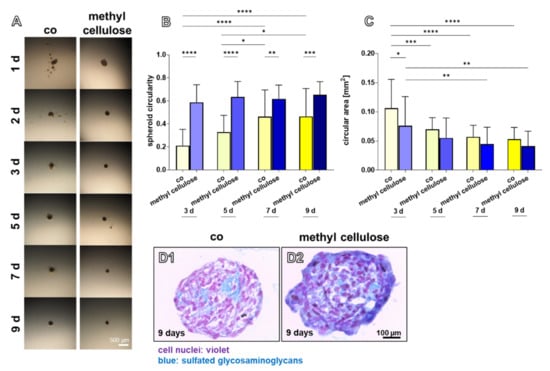 Effect of methyl cellulose on spheroids produced with the HD methods and monitored for 9 days. (A) native spheroids are shown after different culturing days in hanging drops (1–3, 5, 7, and 9 days). (B) spheroid circularity, (C) circular area (co: control, yellow bars). (D1–2) Alcian blue staining of a central section of the control (D1) spheroids and those (D2) treated with methyl cellulose. Spheroids consisted of 1 × 104 cells. 10 spheroids per day and per experiment were analyzed. Representative images are shown derived from three independent experiments. Scale bars: 500 µm (A), 100 µm (D1,D2). Statistics: n = 3 independent experiments were performed with cells of three different donors. One-way ANOVA (Tukey’s multiple comparisons test) for comparison between groups. p values: * <0.05, ** <0.01, *** <0.001, **** < 0.0001 (B,C).