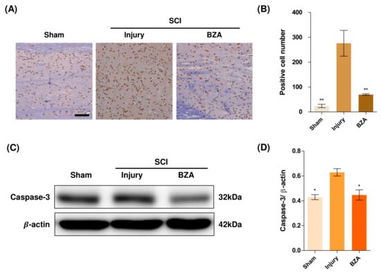 2.4. BZA Attenuates Caspase-3-Induced Apoptotic Activity after SCI in Rats